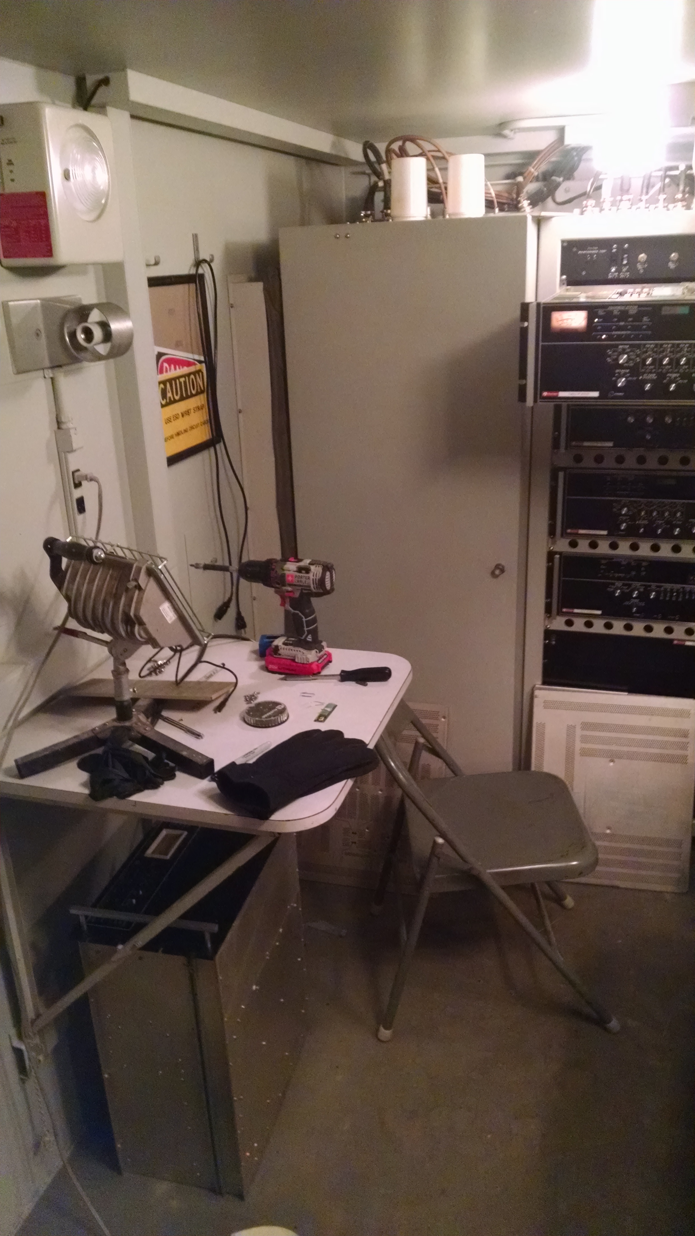 From the door looking toward the radio rack. The left cabinet houses the power amplifiers and their power supplies. The center rack holds the exciters/transmitters, receivers and preselectors. The workbench/desk is up and locked into place, holding various items as I work inside the van. I need to pick up some new LED lights for the shelter lighting; meanwhile I'm using a halogen floor light.