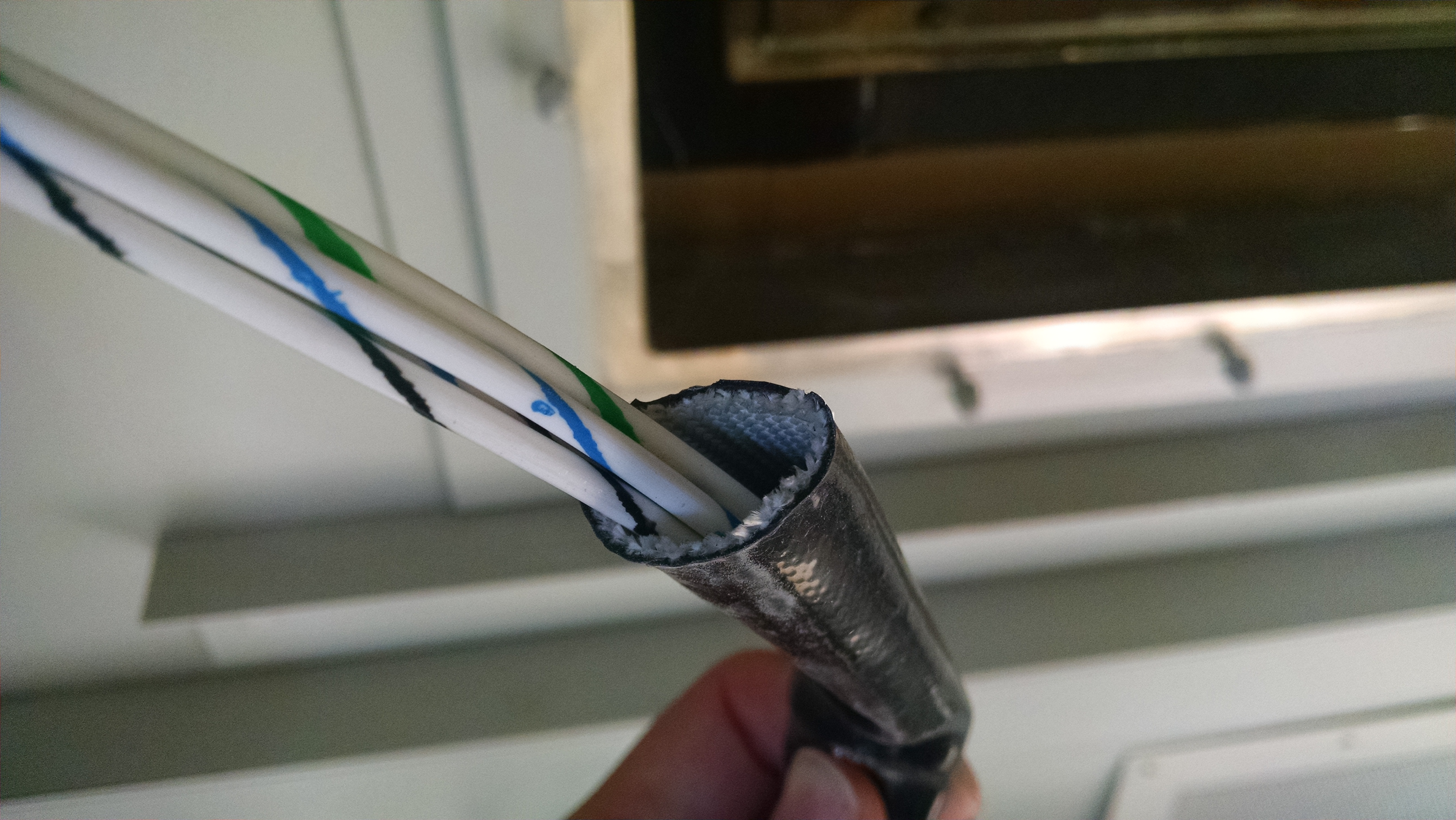 The opposite end of the wire sleeve, where the wire bundle exits and is run to other locations in the power distribution panel.