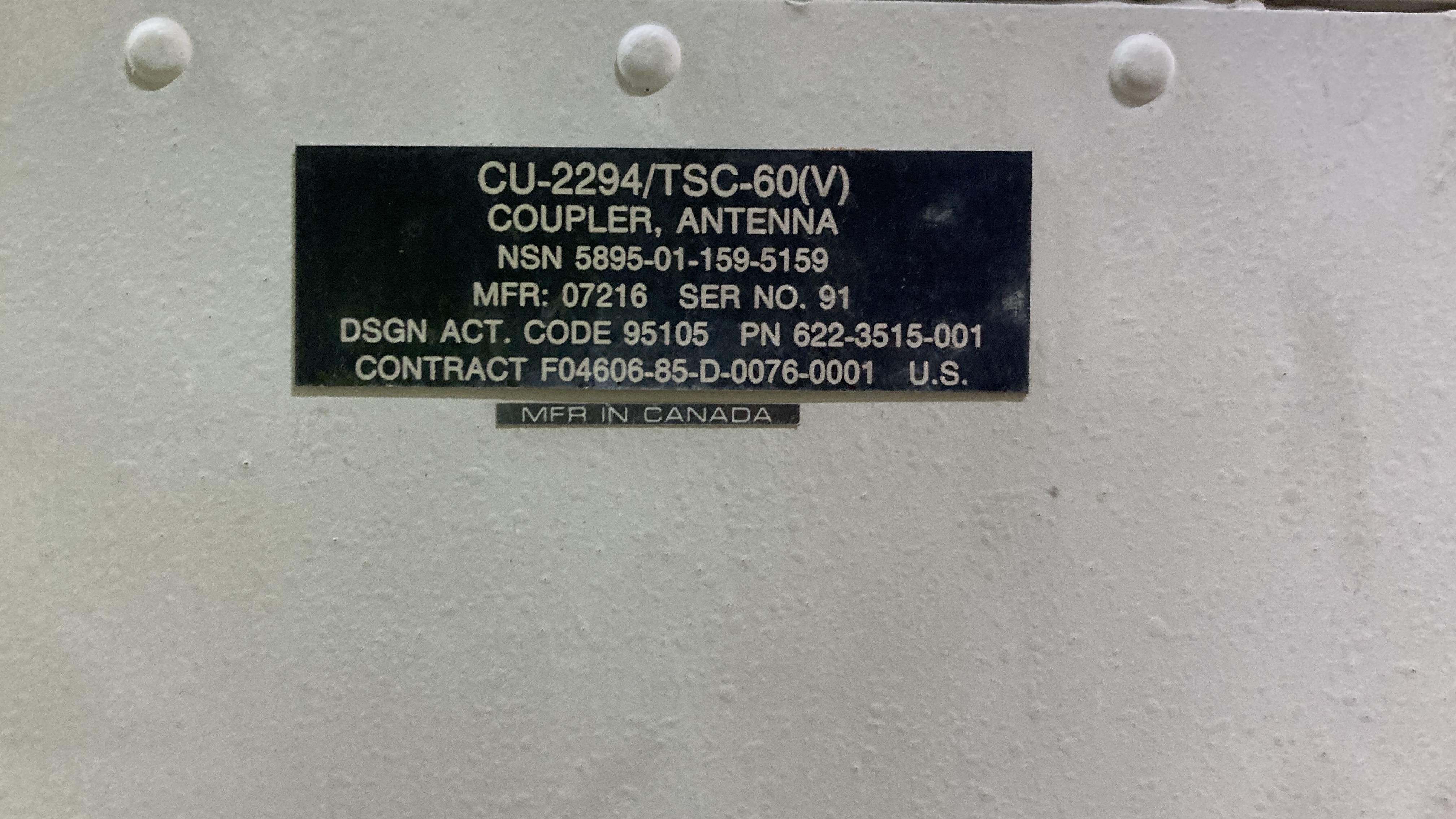 The part number tag of the HF-8040A antenna coupler.