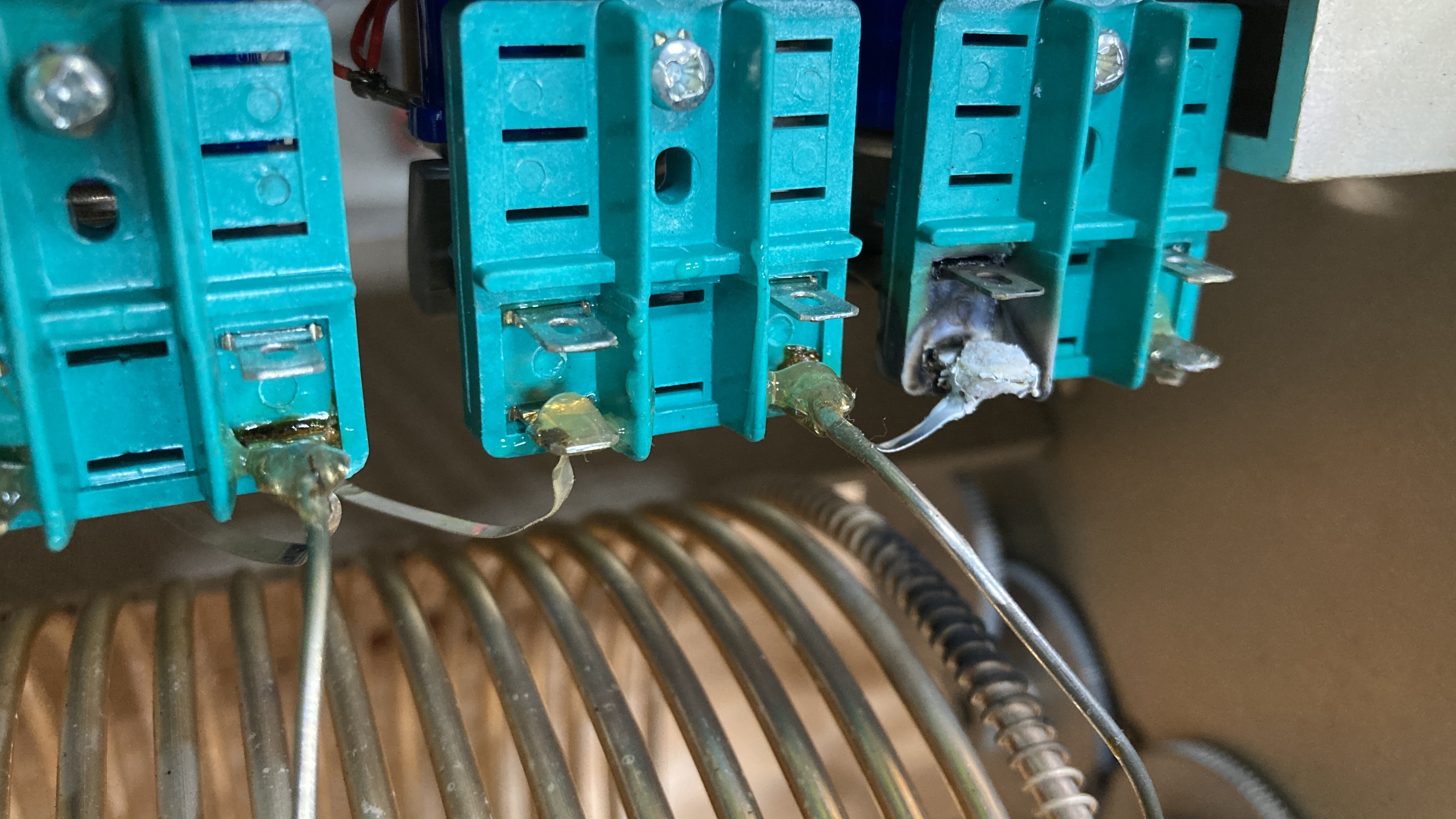 Visual inspection of the coil assembly rapidly revealed a burnt contact on relay K1. This is the first relay in the grounding system to the tuning coil.